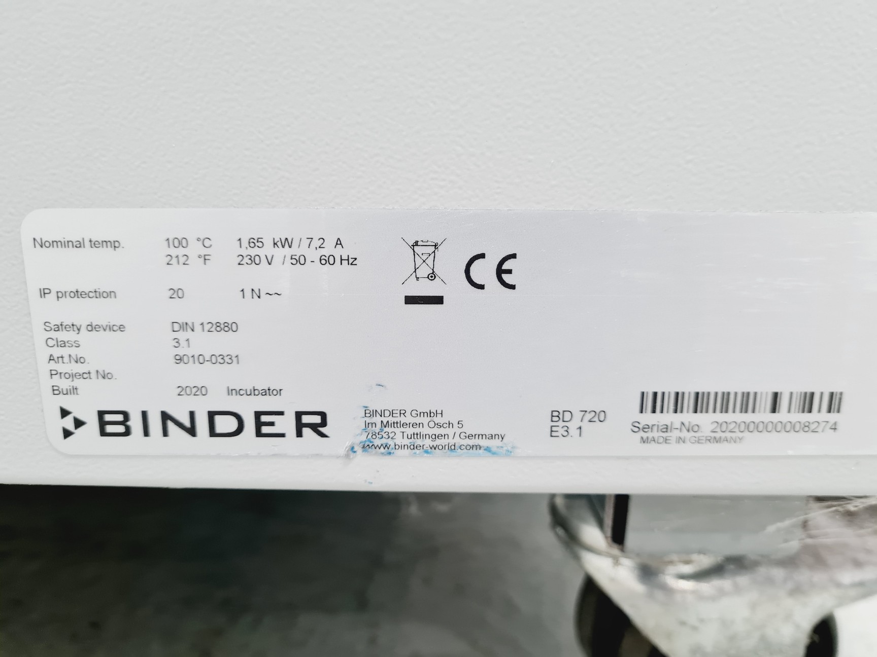 Binder Model No. BD 720 E3.1 Incubator Lab