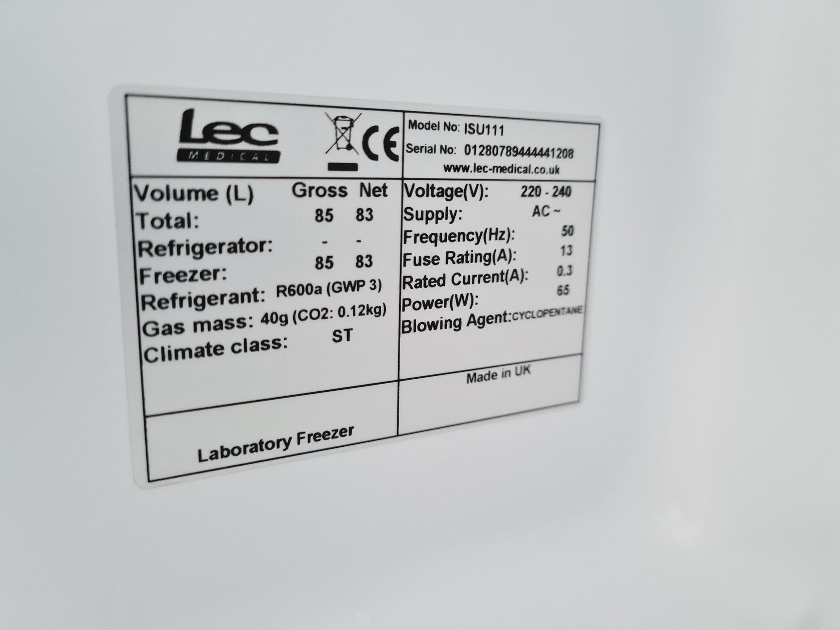 LEC+ Model No. ISU111S Medical Freezer Laboratory