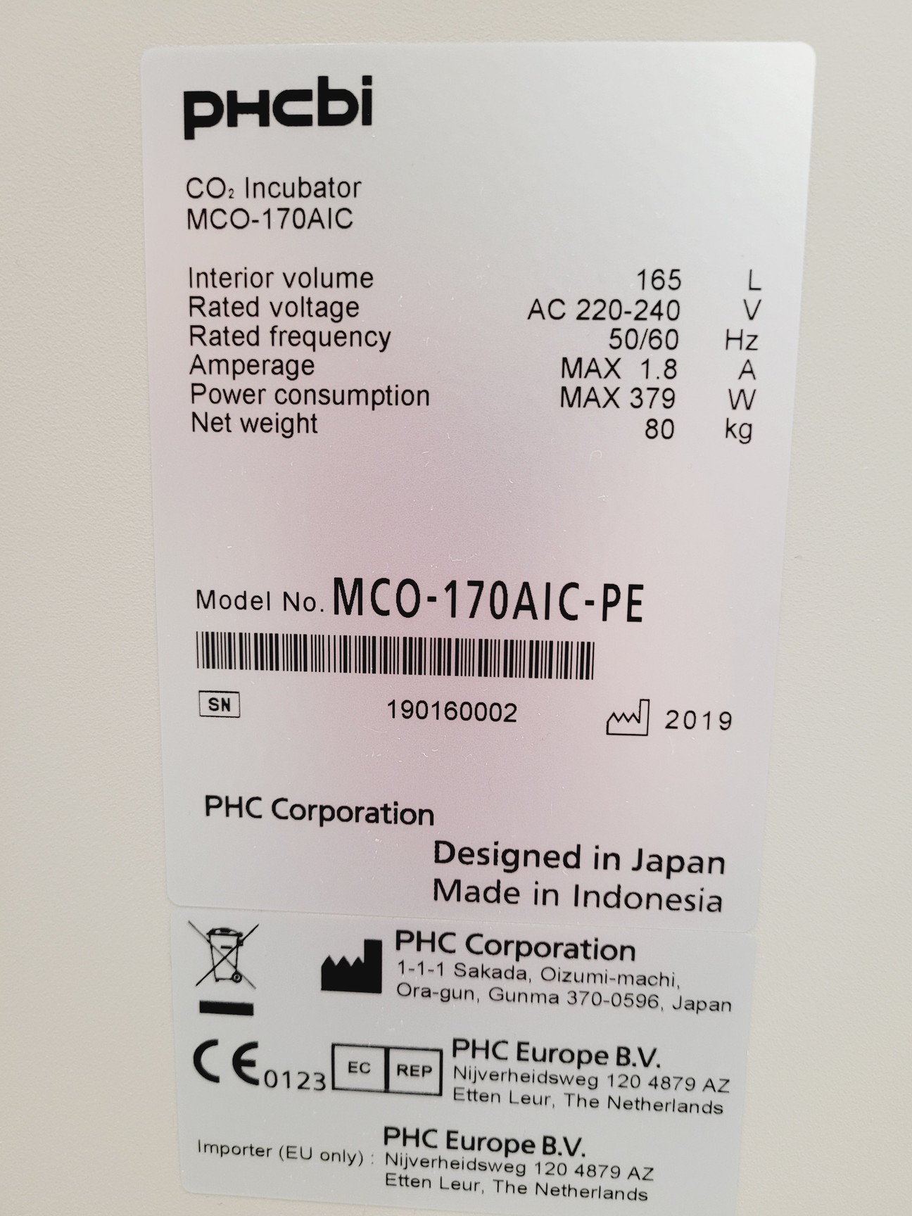 PHCBI CO2 Incubator Model MCO-170AIC-PE With Shelving And Tray Lab