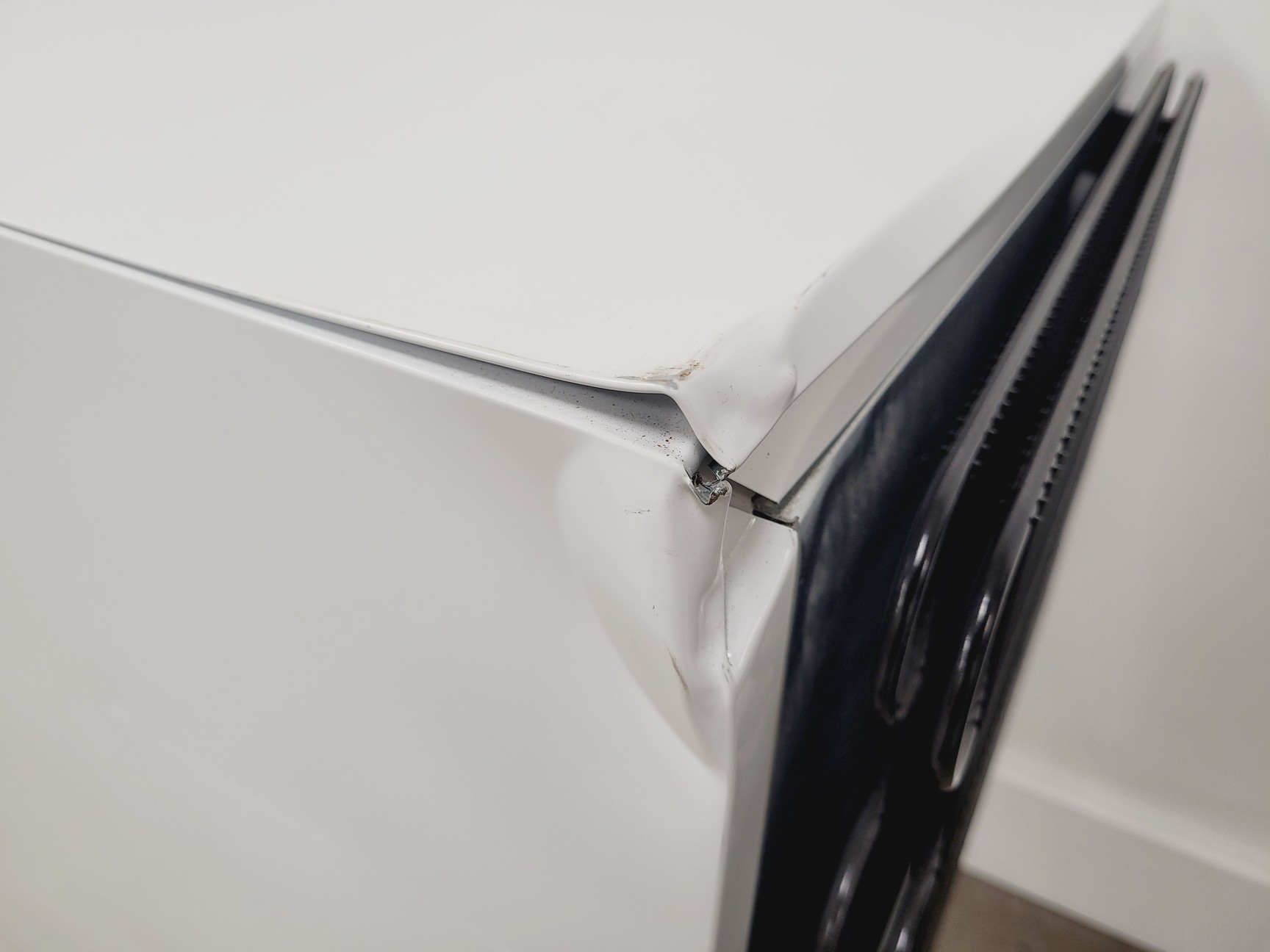The freezer appears to be unused or like new; however, it has sustained cosmetic damage, including large dents on two corners and the key lock is also loose within its frame.